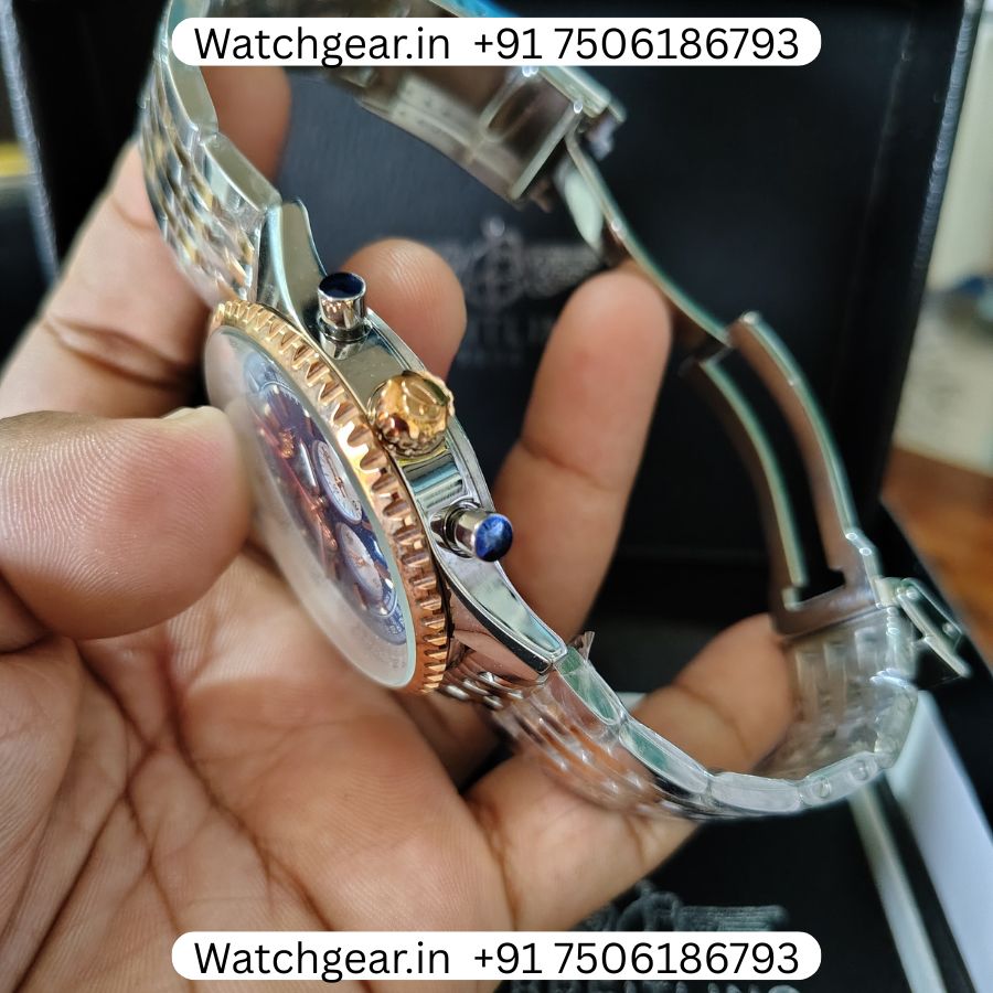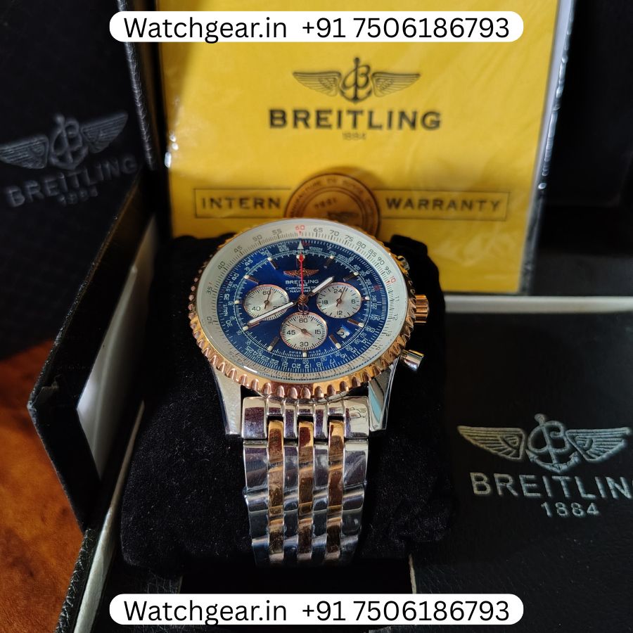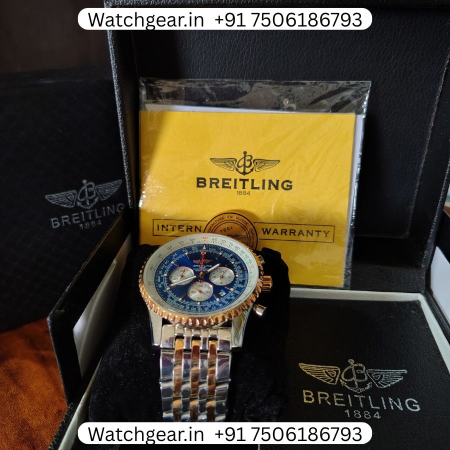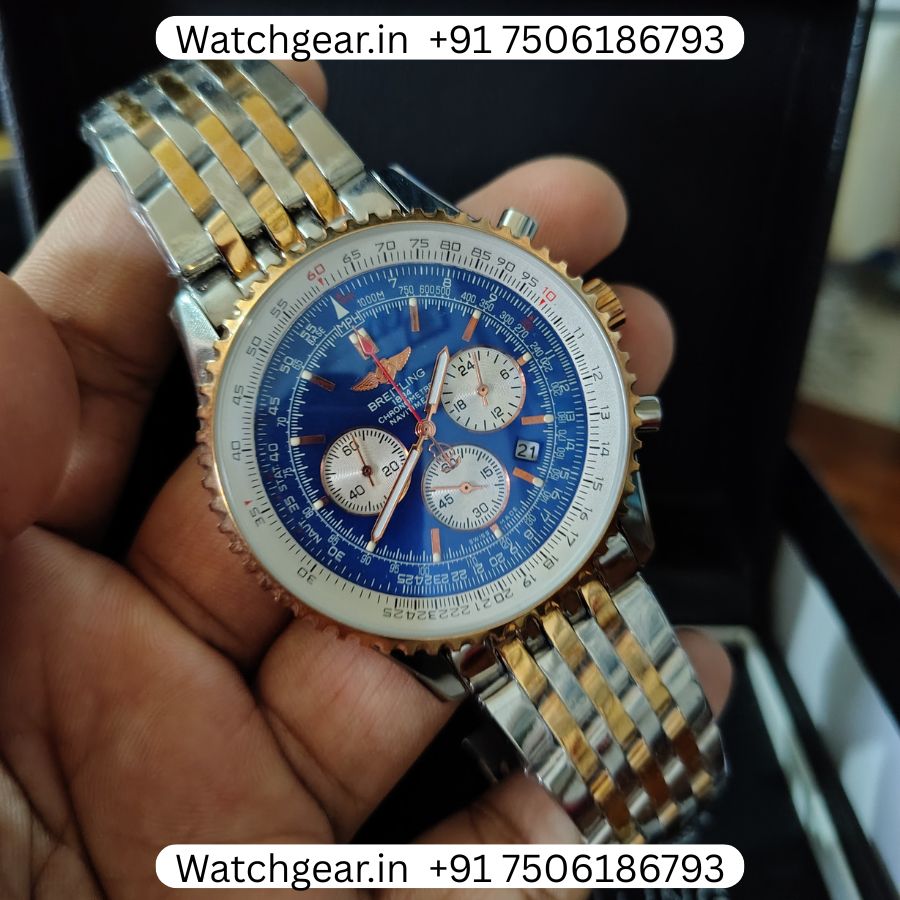 The Breitling Navitimer B01 Blue Dial Dual Tone Watch is a bold and stylish watch known for its classic aviation-inspired design. It features a deep blue dial with detailed chronograph sub-dials, paired with a dual-tone finish that combines steel and gold for a rich and premium look. The dial has a busy yet iconic layout that gives it a strong presence on the wrist while still being practical to read. Powered by automatic movement, this watch reflects the precision and engineering that Breitling is known for, inspired by the legendary Breitling Navitimer collection, which has been a pilot’s favorite for decades.