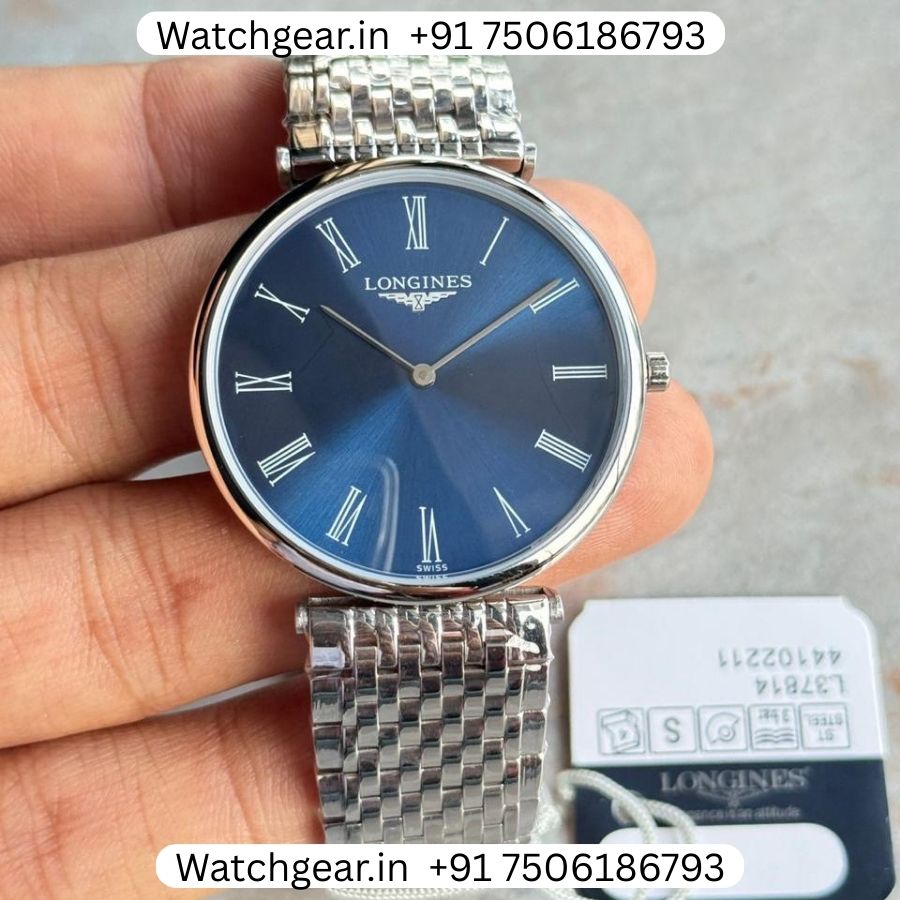 The Longines La Grande Classique Blue Dial Steel ‘SLIM’ Watch is a clean and elegant timepiece designed for a modern yet classic look. It features a deep blue dial paired with a polished steel finish, giving the watch a sharp and premium feel that stands out without being too flashy. Its ultra-slim design makes it lightweight and very comfortable for all-day wear, whether for office use or special occasions. Built with the trusted craftsmanship that Longines is known for, this watch is inspired by the timeless Longines La Grande Classique collection and offers a perfect mix of style and simplicity.