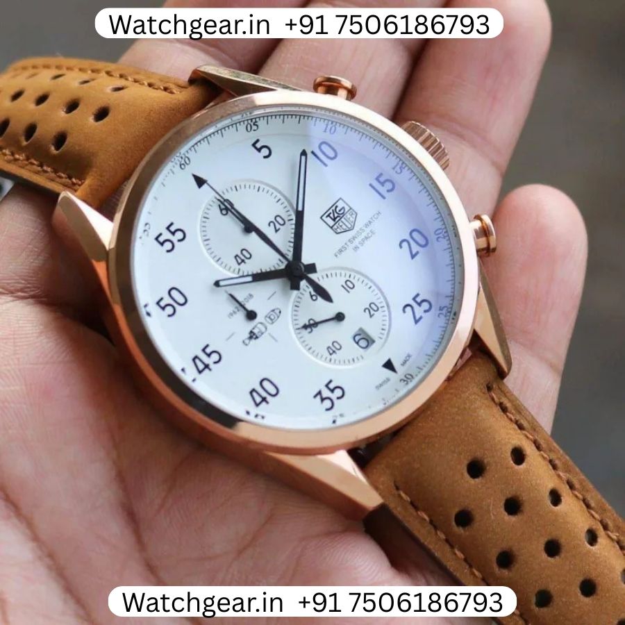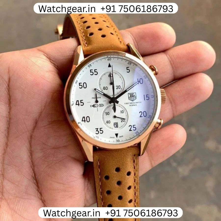 The Tag Heuer SpaceX Rose Gold Brown Leather Strap Watch is a bold and high quality watch inspired by the space heritage and racing design of the TAG Heuer Carrera collection. It features a polished rose gold finish paired with a classic brown leather strap, giving the watch a rich and stylish look that stands out on the wrist. The detailed chronograph-style dial adds a sporty touch while maintaining a clean and elegant feel, making it suitable for both daily wear and special occasions. Inspired by the legacy of space-themed models like the TAG Heuer Carrera 1887 SpaceX, this watch combines design, comfort, and reliable performance in one.